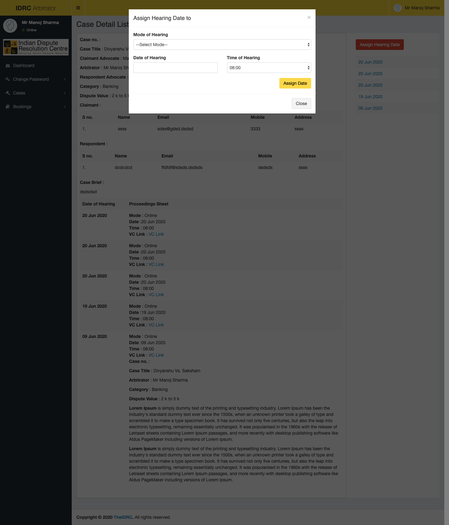 For carrying out an online hearing the Arbitrator (Mediator or Conciliator), Advocate and the Client can also Login into their account and reach their Case Page through their IDRC Dashboard.