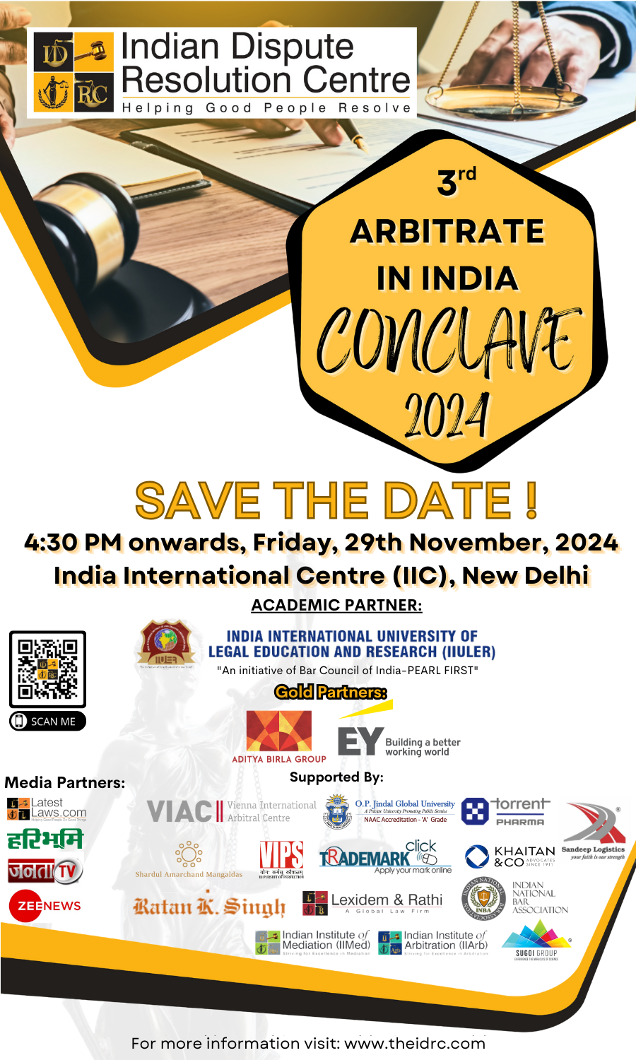 After the success of Arbitrate in India Conclave 2023, the Indian Dispute Resolution Centre is back with the 3rd Arbitrate in India Conclave 2024 on 29th November 2024 at Multi-Purpose Hall, India International Centre, New Delhi.